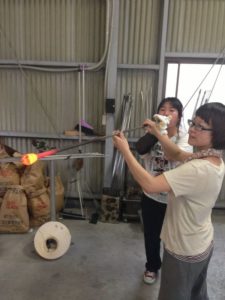 それぞれ自分の作りたいデザインを絵にかいて早速開始。テレビなどで見たことがある人も多いと思いますが息を吹き込んでガラスを広げていく作業がすごく大変でした。顔を真っ赤にしながらふくらませました。思いっきり吹いてやっと広がりました。
