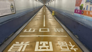 関門『トンネル』人道の、県境を示す線(2023年1月3日、福岡県北九州市)
