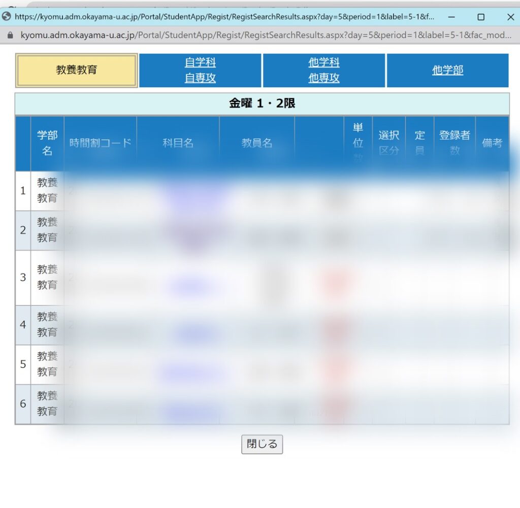 ここから自分が受講したい講義を選択して、①で示した表を埋めていくのが履修登録という作業です。ちなみにこのウィンドウに表示されている講義名をクリックすると岡山大学シラバスに飛ぶことが出来るので、授業の詳細を確認できたりします(ちなみに表の方では講義名をクリックするとmoodle、講義番号を押すとシラバスに飛びます)。この科目が教養教育のうちどの分類(現代と〇〇、など)になるかはこの方法で確認してください。