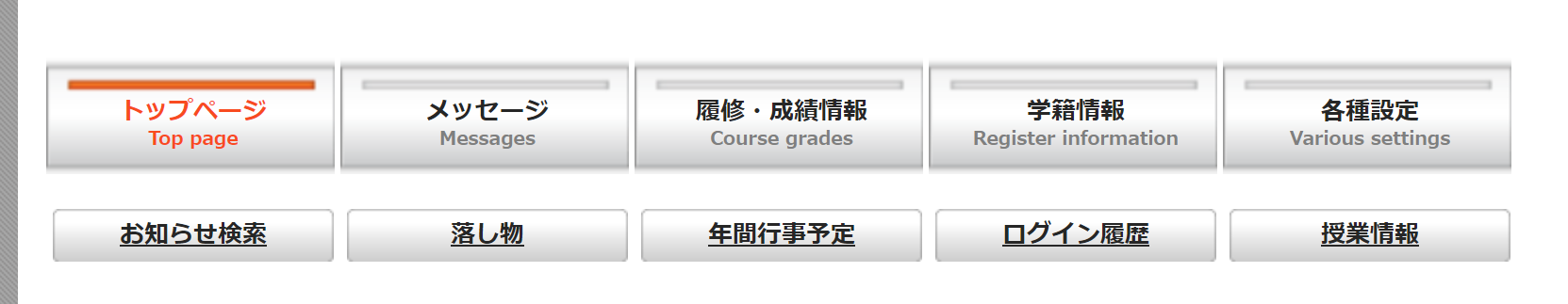 履修登録ページは岡山大学学務情報システムの中にあります。ここに入ると以下のようなメニューが表示されています。