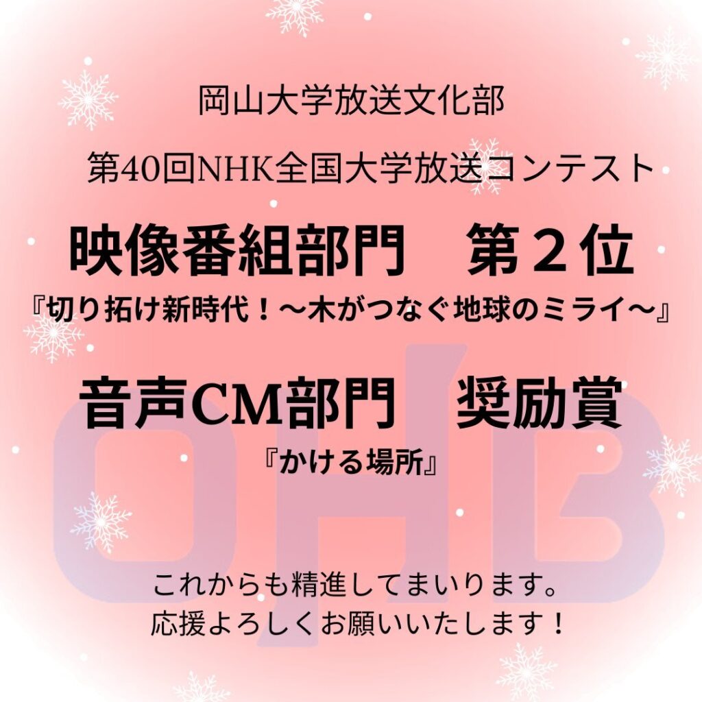 今月2日、京都府京都市の京都アスニーにて行われた「第40回NHK全国大学放送コンテスト」の本選大会に、岡山大学放送文化部が(昨年に引き続き)今年も出場しました!